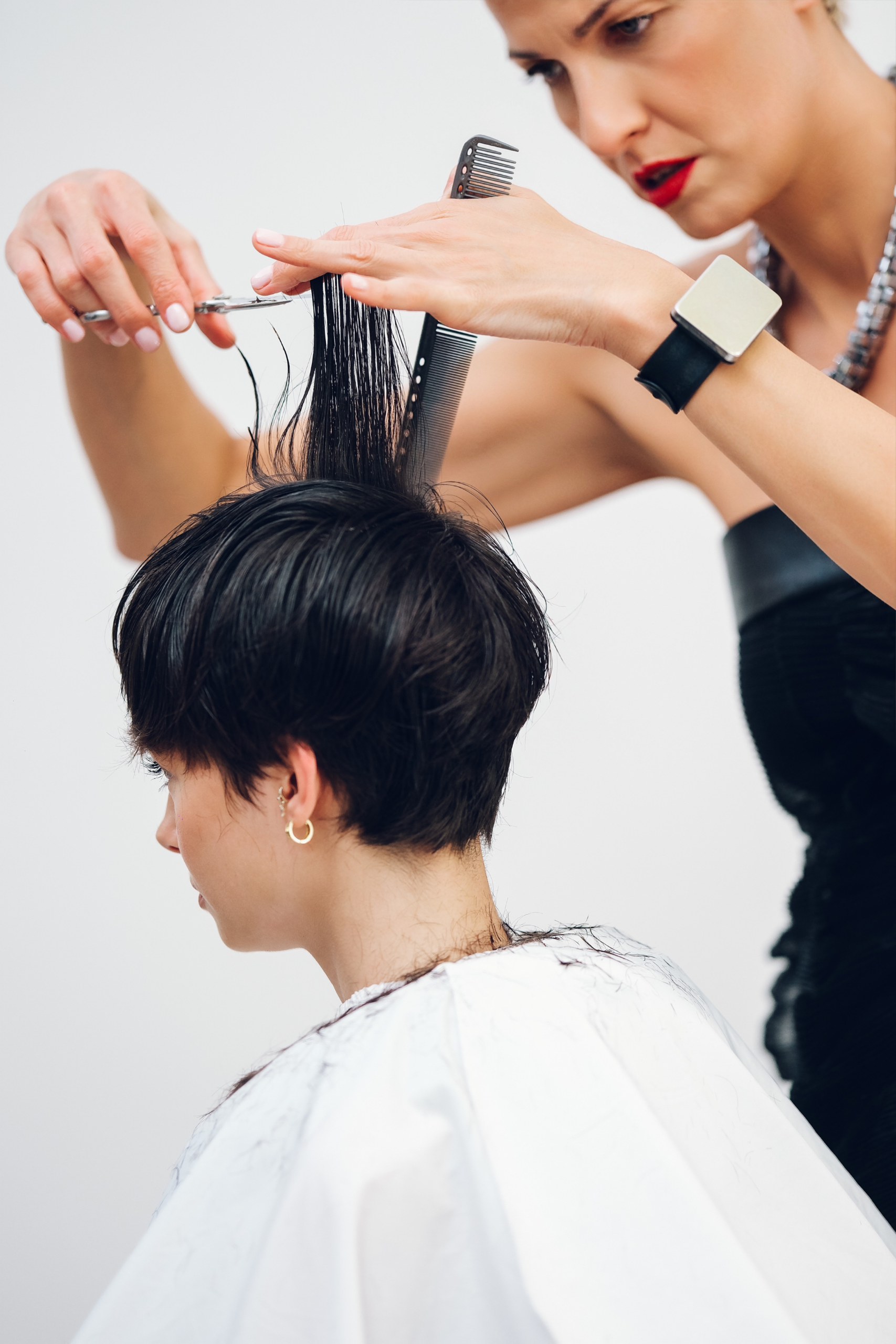 - Работа под правильным углом для корректного снятия массы в нижней части причёски.